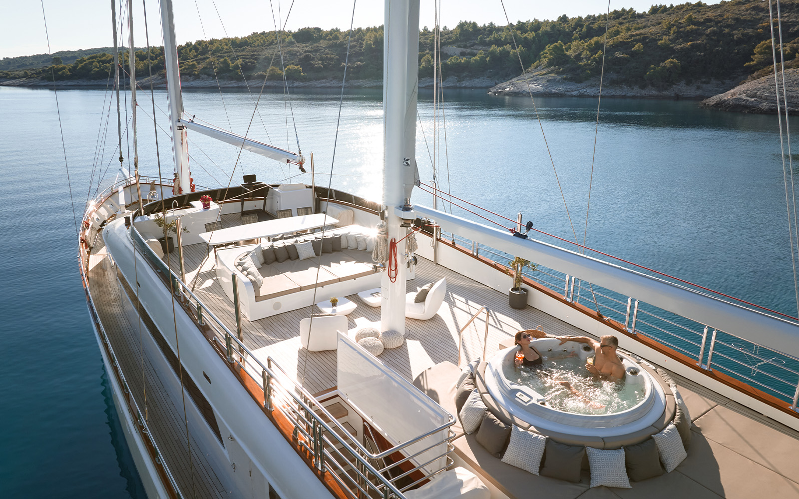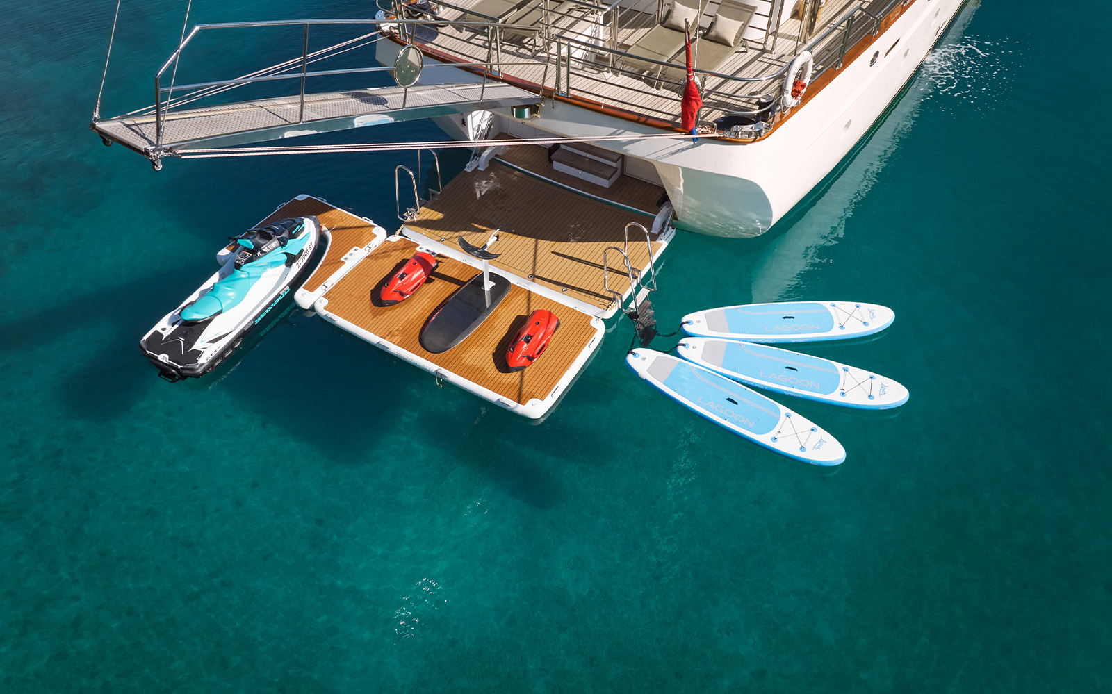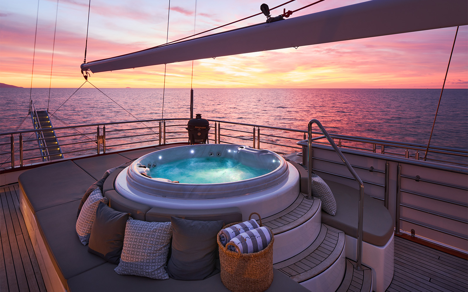 On a plush sun deck, enjoy relaxing in style thanks to Jacuzzi surrounded by pillows; recline and soak up the sun on deckchairs, or take an exciting adventure out at sea, guided by top-of-the-line water toys.