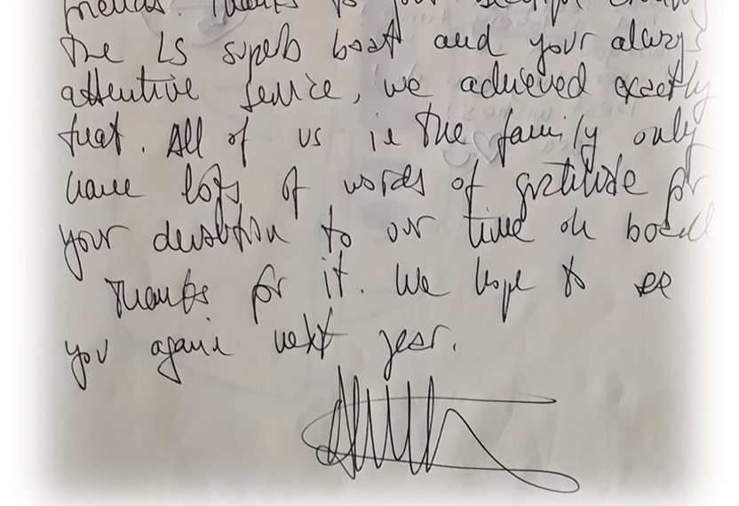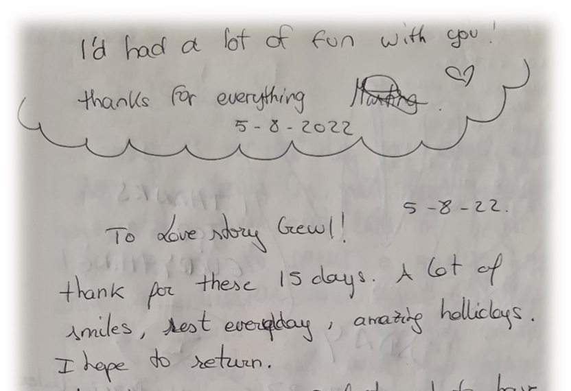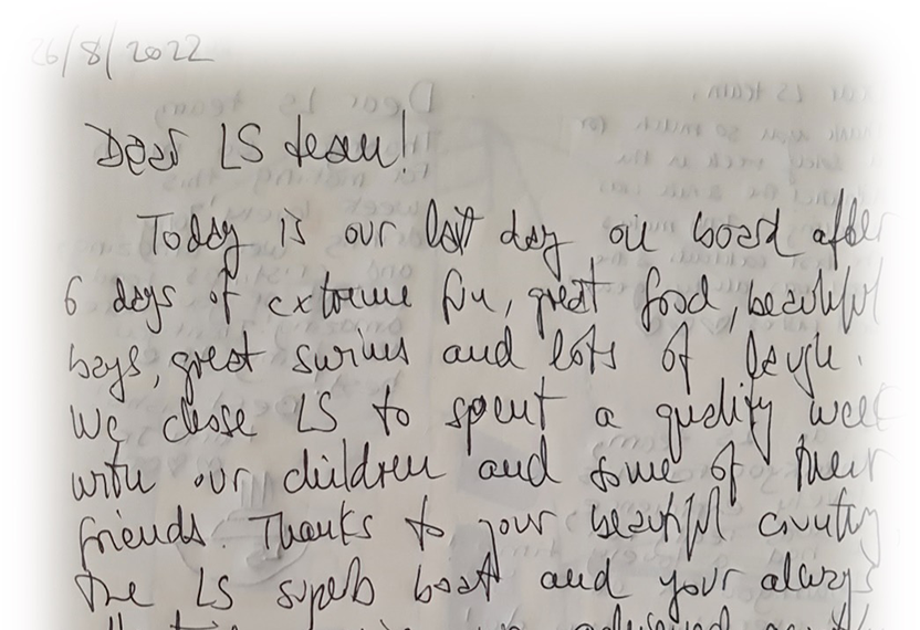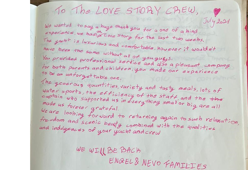 We wanted to say a huge thank you for a one-of-a-kind experience, we had on a Love Story for the last two weeks. The yacht is luxurious and comfortable. However, it wouldn’t have been the same without all of you guys. You provided professional service and also a pleasant company for both parents and children, you made our experience to be an unforgettable one.